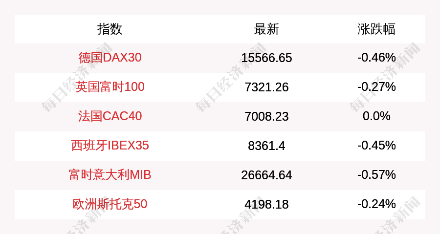 每经AI快讯:北京时间12月10日16:00,德国DAX30指数开盘下跌72.61点,跌幅为0.46%,报15566.65点;英国富时100指数开盘下跌19.97点,跌幅为0.27%,报7301.29点;法国CAC40指数平开,报7008.23点;西班牙IBEX35指数开盘下跌38.2点,跌幅为0.45%,报8361.4点;富时意大利MIB指数开盘下跌152.74点,跌幅为0.57%,报26664.64点;欧洲斯托克50指数开盘下跌10.12点,跌幅为0.24%,报4198.18点。