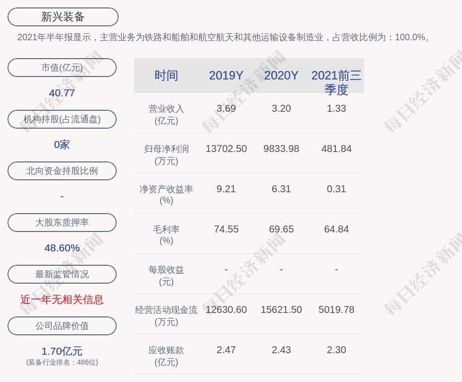 2021年半年报显示,新兴装备的主营业务为铁路和船舶和航空航天和其他运输设备制造业,占营收比例为:100.0%。