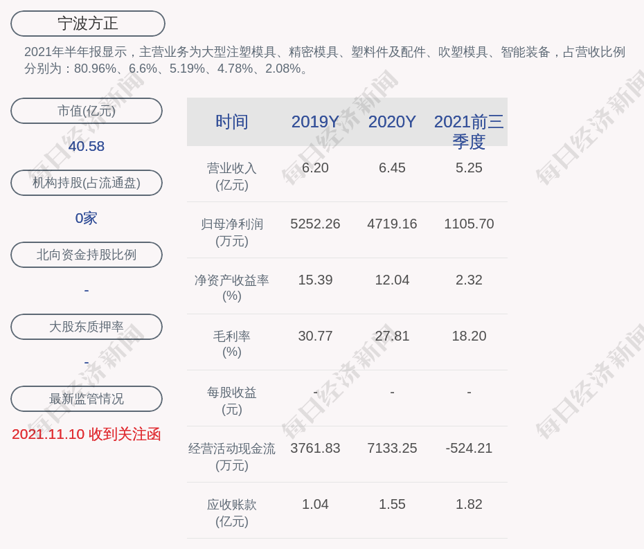 2021年半年报显示,宁波方正的主营业务为大型注塑模具、精密模具、塑料件及配件、吹塑模具、智能装备,占营收比例分别为:80.96%、6.6%、5.19%、4.78%、2.08%。