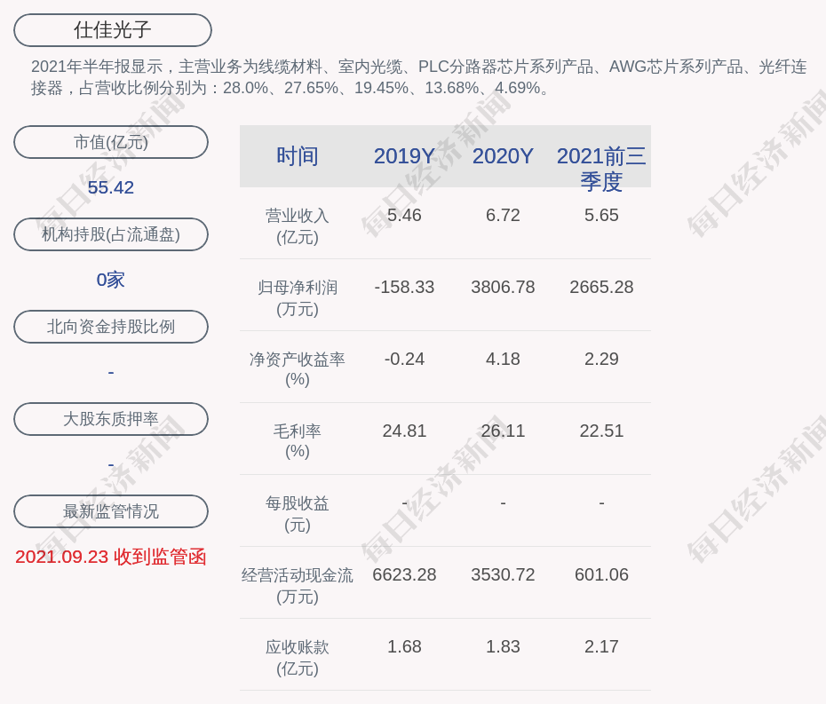 2021年半年报显示,仕佳光子的主营业务为线缆材料、室内光缆、PLC分路器芯片系列产品、AWG芯片系列产品、光纤连接器,占营收比例分别为:28.0%、27.65%、19.45%、13.68%、4.69%。