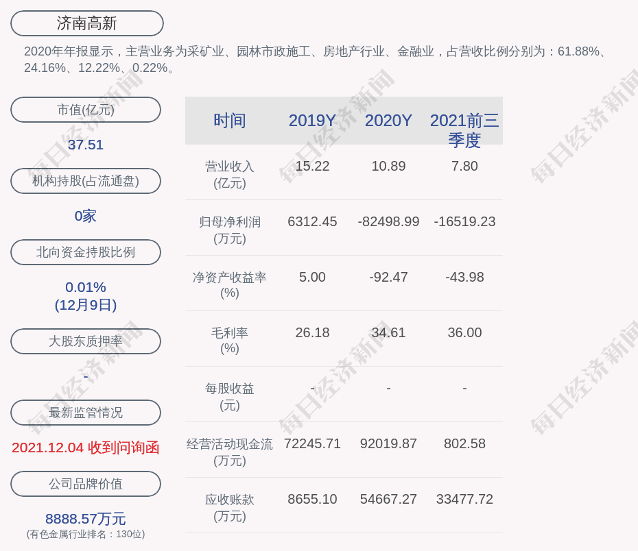2020年年报显示,济南高新的主营业务为采矿业、园林市政施工、房地产行业、金融业,占营收比例分别为:61.88%、24.16%、12.22%、0.22%。
