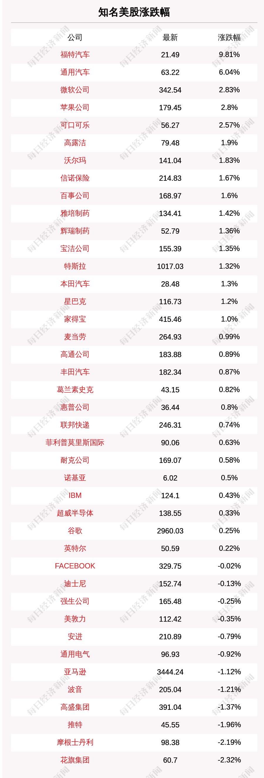 每经AI快讯:北京时间12月11日05:00,知名美股中福特汽车、通用汽车、微软公司、苹果公司、可口可乐涨幅居前,收盘分别上涨9.81%、6.04%、2.83%、2.8%、2.57%。花旗集团、摩根士丹利、推特、高盛集团、波音跌幅居前,收盘分别下跌2.32%、2.19%、1.96%、1.37%、1.21%。