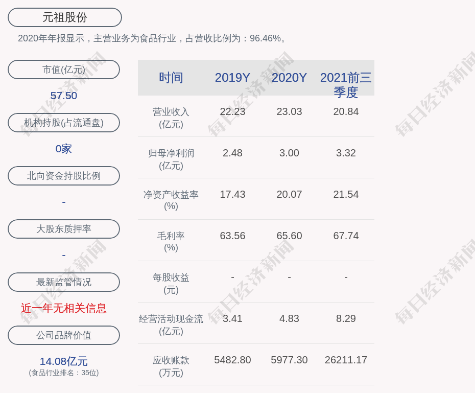 2020年年报显示,元祖股份的主营业务为食品行业,占营收比例为:96.46%。