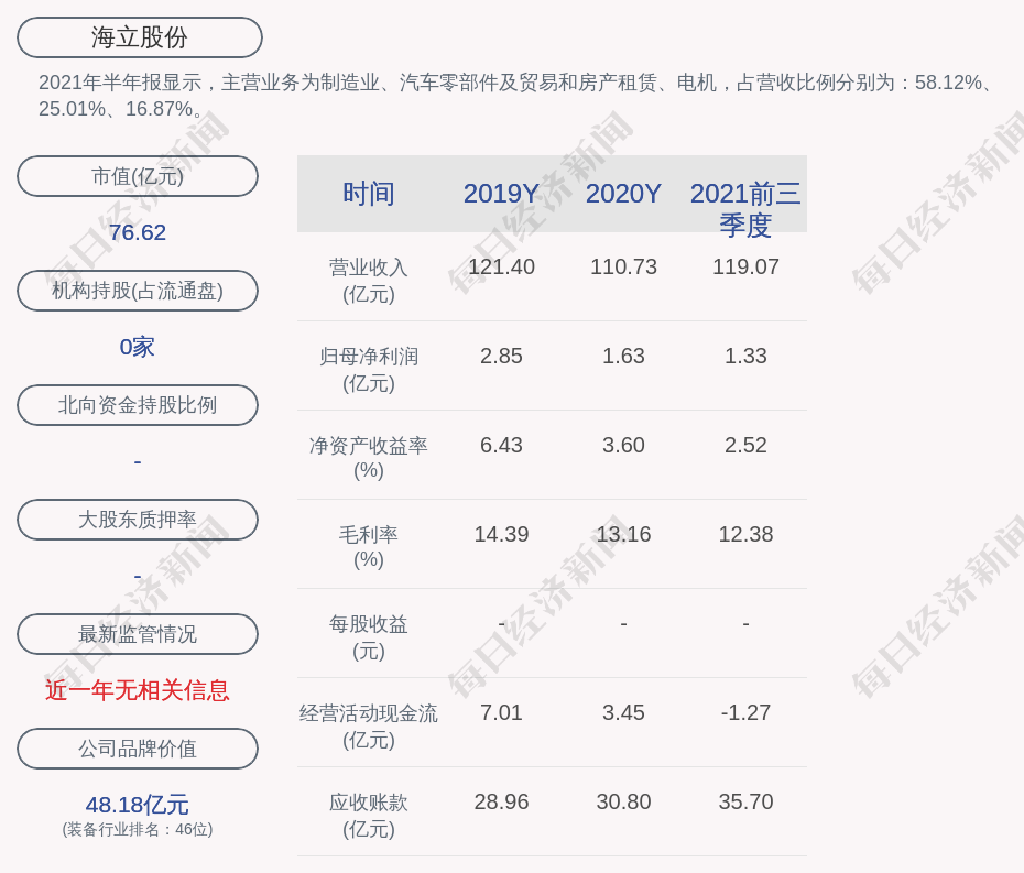 2021年半年报显示,海立股份的主营业务为制造业、汽车零部件及贸易和房产租赁、电机,占营收比例分别为:58.12%、25.01%、16.87%。