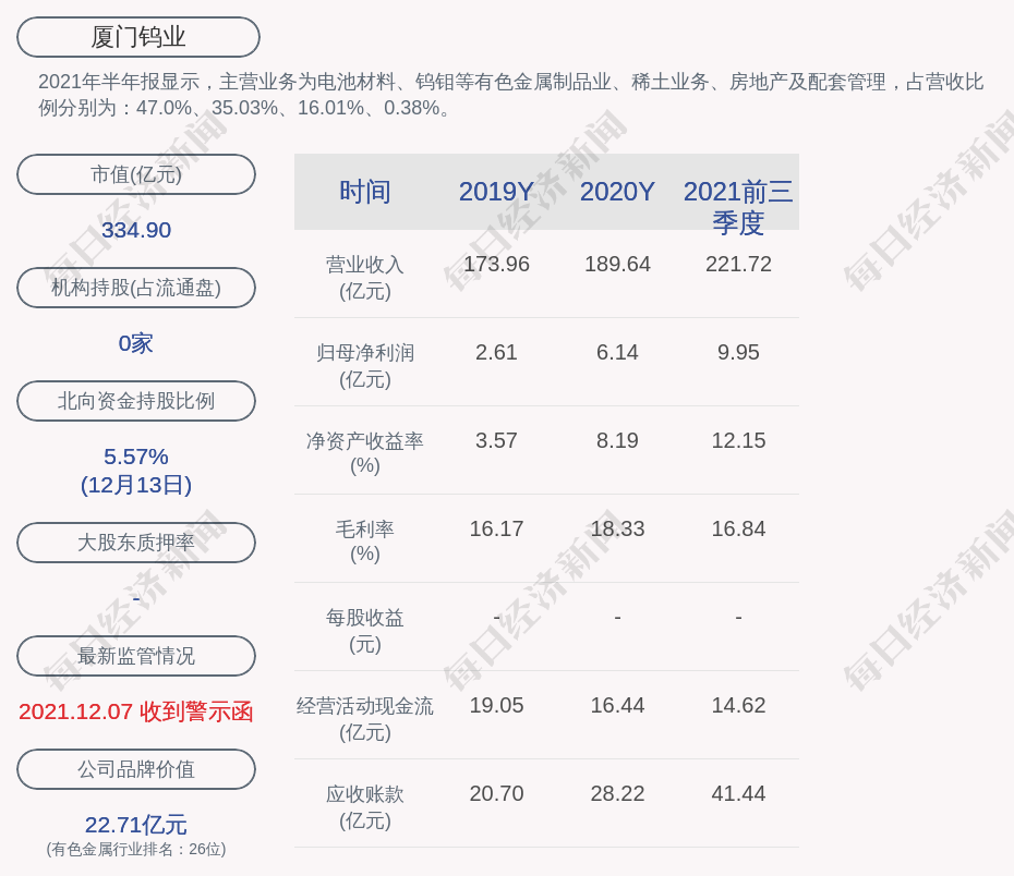 2021年半年报显示,厦门钨业的主营业务为电池材料、钨钼等有色金属制品业、稀土业务、房地产及配套管理,占营收比例分别为:47.0%、35.03%、16.01%、0.38%。