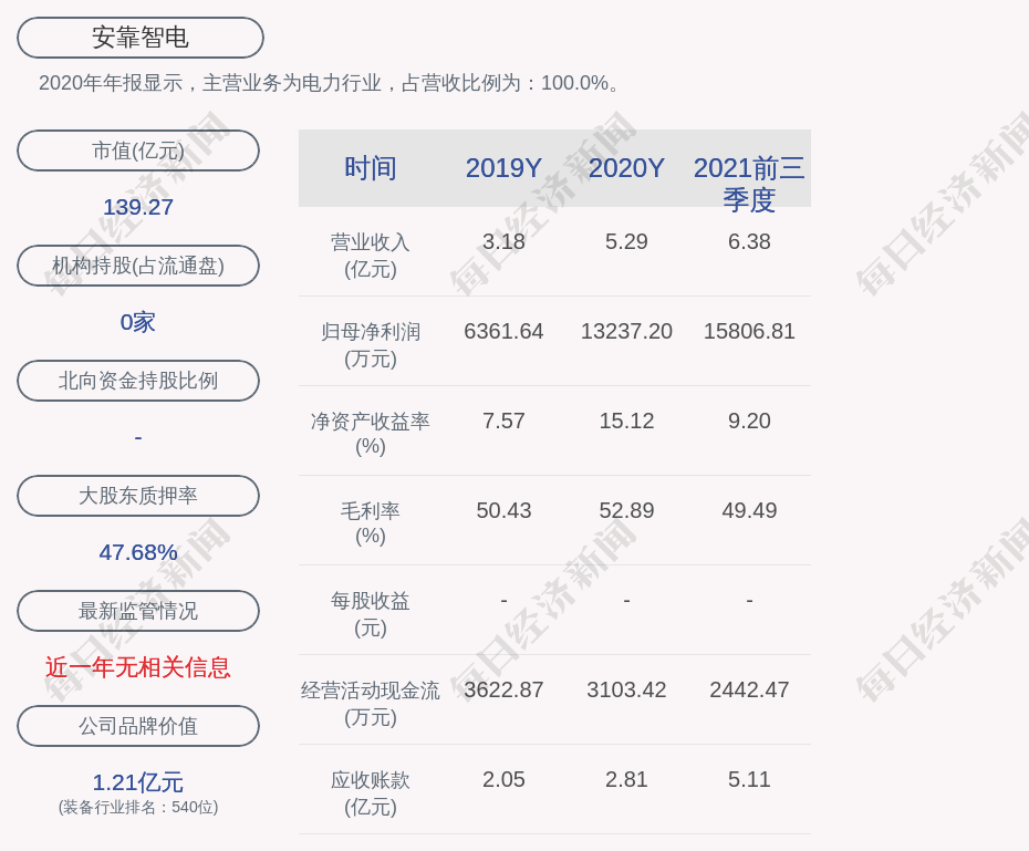 2020年年报显示,安靠智电的主营业务为电力行业,占营收比例为:100.0%。