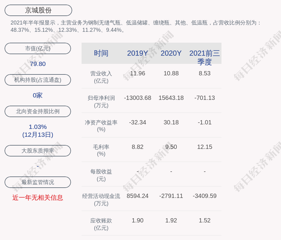 2021年半年报显示,京城股份的主营业务为钢制无缝气瓶、低温储罐、缠绕瓶、其他、低温瓶,占营收比例分别为:48.37%、15.12%、12.33%、11.27%、9.44%。