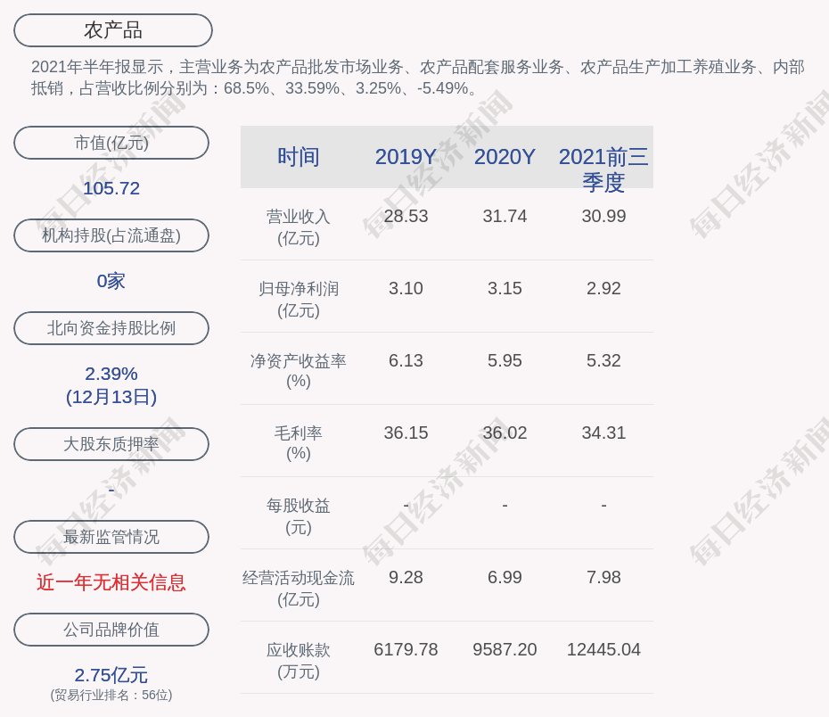 2021年半年报显示,农产品的主营业务为农产品批发市场业务、农产品配套服务业务、农产品生产加工养殖业务、内部抵销,占营收比例分别为:68.5%、33.59%、3.25%、-5.49%。