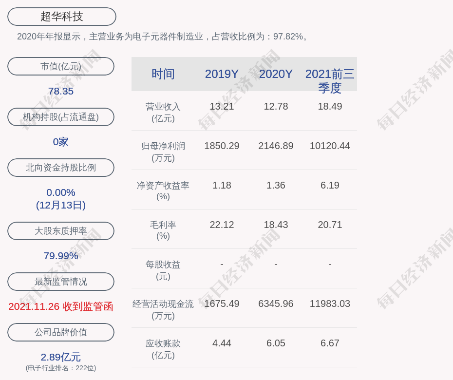 2020年年报显示,超华科技的主营业务为电子元器件制造业,占营收比例为:97.82%。