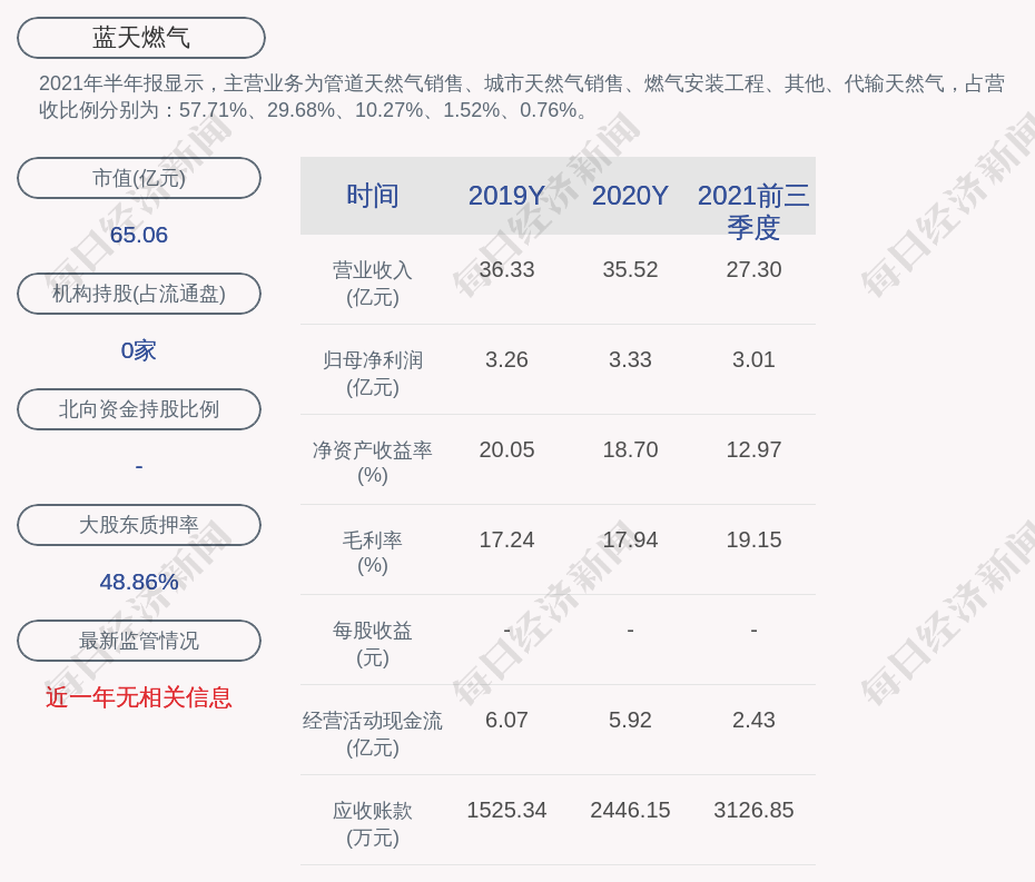 2021年半年报显示,蓝天燃气的主营业务为管道天然气销售、城市天然气销售、燃气安装工程、其他、代输天然气,占营收比例分别为:57.71%、29.68%、10.27%、1.52%、0.76%。