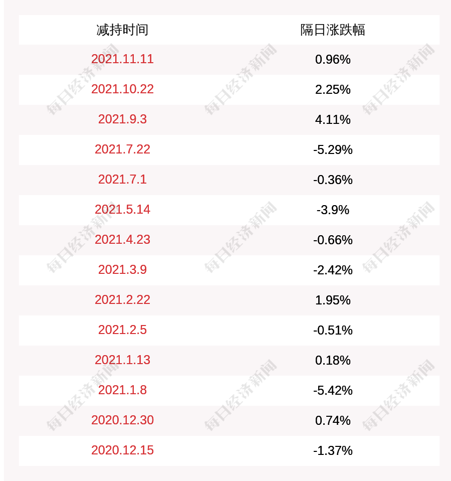 3. 新开源上次发布减持公告是2021年11月11日,第二个交易日上涨0.96%,新开源近一年共发布15次减持类公告。