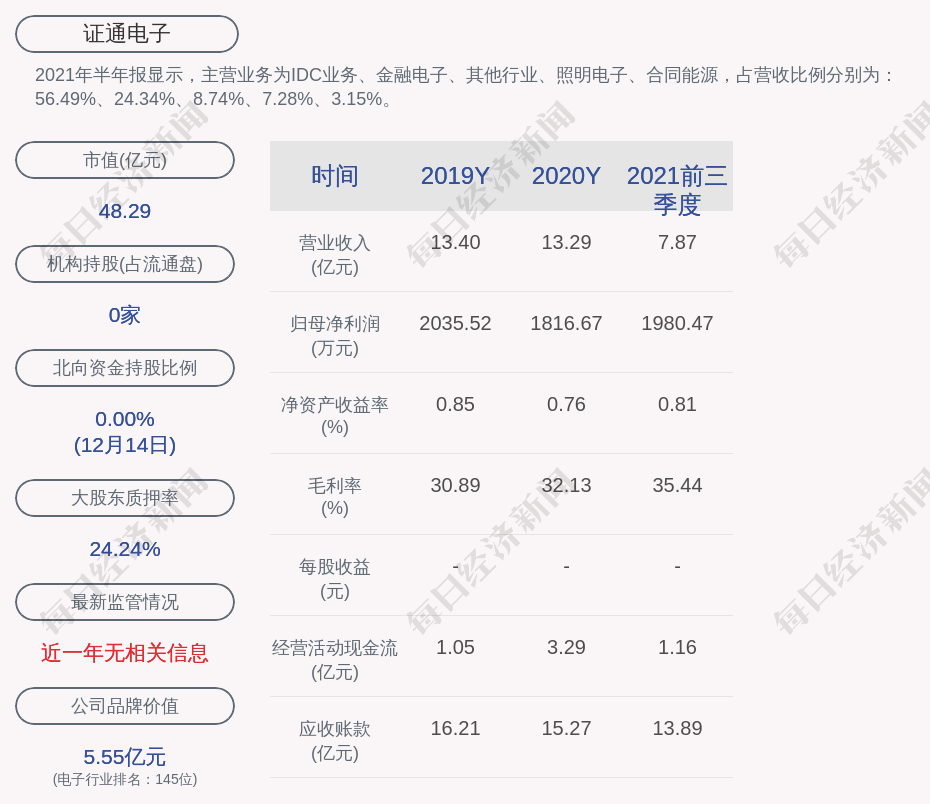 2021年半年报显示,证通电子的主营业务为IDC业务、金融电子、其他行业、照明电子、合同能源,占营收比例分别为:56.49%、24.34%、8.74%、7.28%、3.15%。
