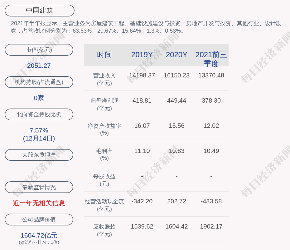 2021年半年报显示,中国建筑的主营业务为房屋建筑工程、基础设施建设与投资、房地产开发与投资、其他行业、设计勘察,占营收比例分别为:63.63%、20.67%、15.64%、1.3%、0.53%。
