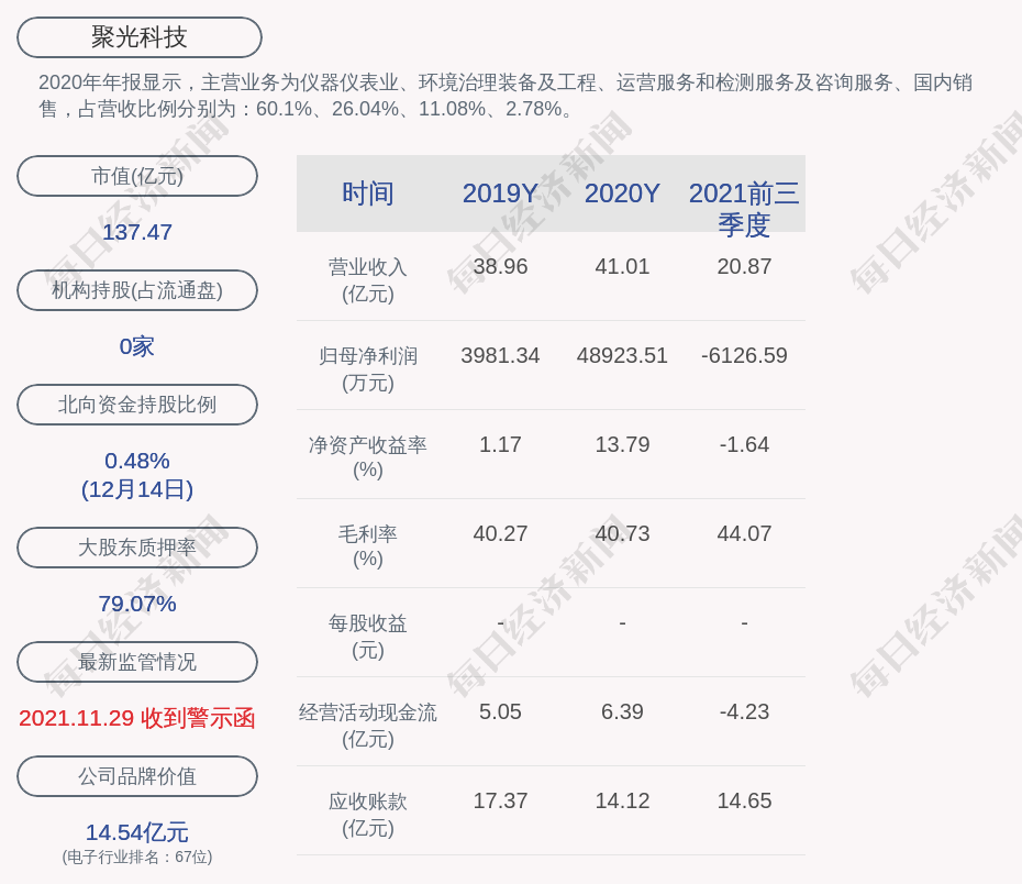 2020年年报显示,聚光科技的主营业务为仪器仪表业、环境治理装备及工程、运营服务和检测服务及咨询服务、国内销售,占营收比例分别为:60.1%、26.04%、11.08%、2.78%。