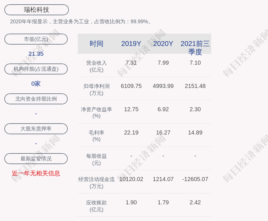 2020年年报显示,瑞松科技的主营业务为工业,占营收比例为:99.99%。