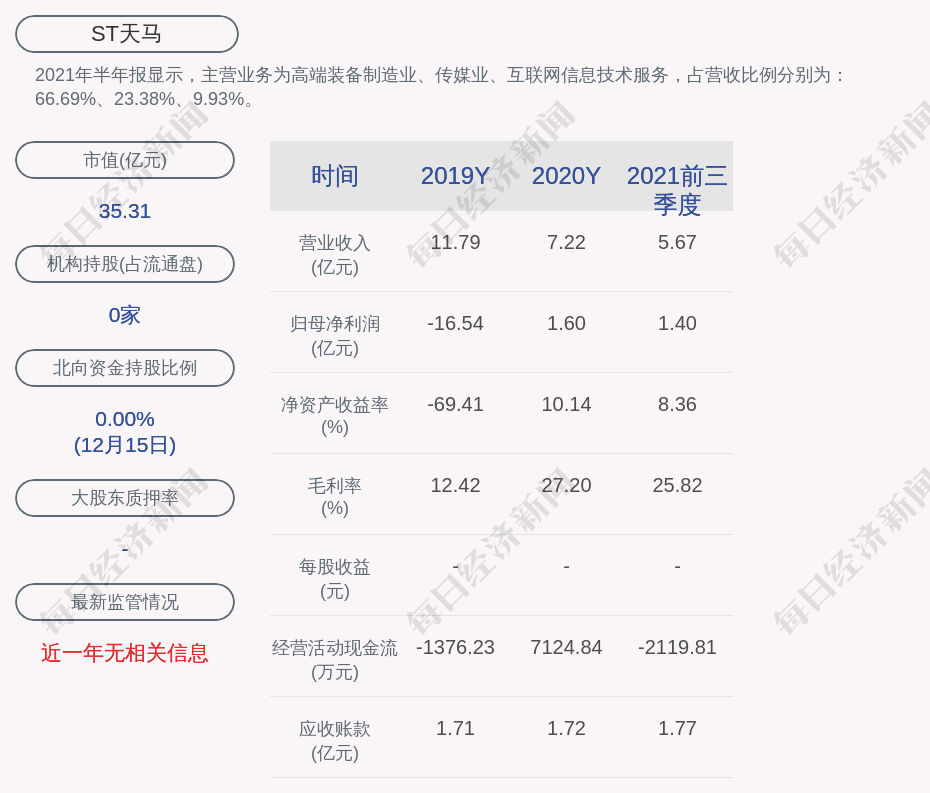 2021年半年报显示,ST天马的主营业务为高端装备制造业、传媒业、互联网信息技术服务,占营收比例分别为:66.69%、23.38%、9.93%。