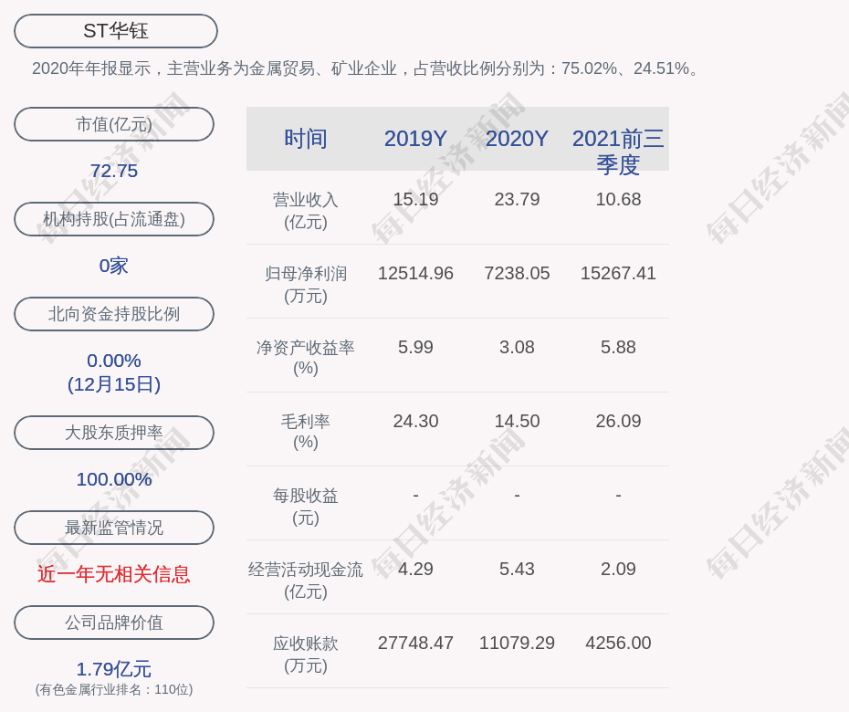 2020年年报显示,ST华钰的主营业务为金属贸易、矿业企业,占营收比例分别为:75.02%、24.51%。