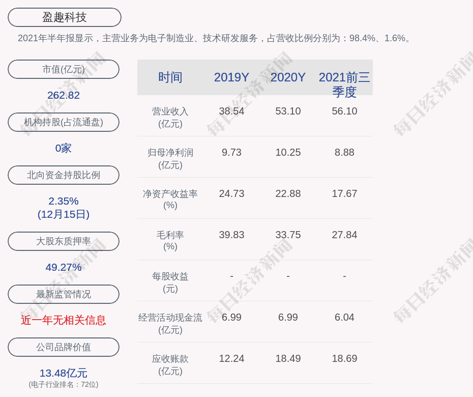 2021年半年报显示,盈趣科技的主营业务为电子制造业、技术研发服务,占营收比例分别为:98.4%、1.6%。