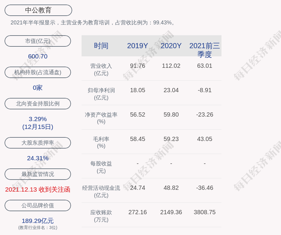 2021年半年报显示,中公教育的主营业务为教育培训,占营收比例为:99.43%。
