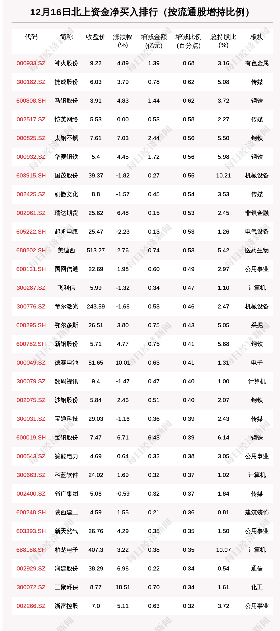 每经AI快讯,12月16日,北上资金净买入的个股共有788只,北上资金加仓比例超1%的有647只。其中,神火股份(000933.SZ,收盘价:9.22元)加仓比例最为明显,最新持股比例3.16%,环比增加0.68个百分点。其他北上资金加仓比例较多的个股还包括捷成股份(300182.SZ,收盘价:6.03元)、马钢股份(600808.SH,收盘价:3.91元)、恺英网络(002517.SZ,收盘价:5.53元)。