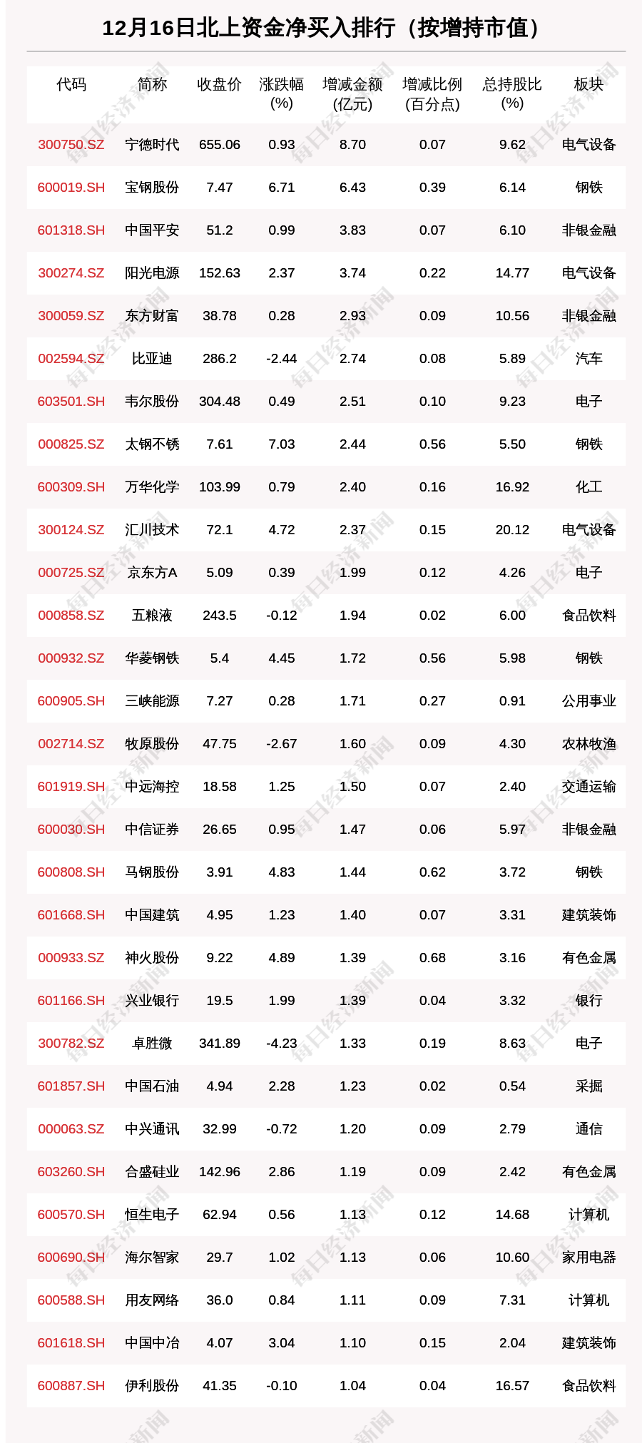 12月16日,按照北向资金增持市值排序,宁德时代(300750.SZ,收盘价:655.06元)增持市值最大,增持市值8.703亿元,环比增加0.69%。其他北上资金增持市值较多的个股还包括宝钢股份(600019.SH,收盘价:7.47元)、中国平安(601318.SH,收盘价:51.2元)、阳光电源(300274.SZ,收盘价:152.63元)。