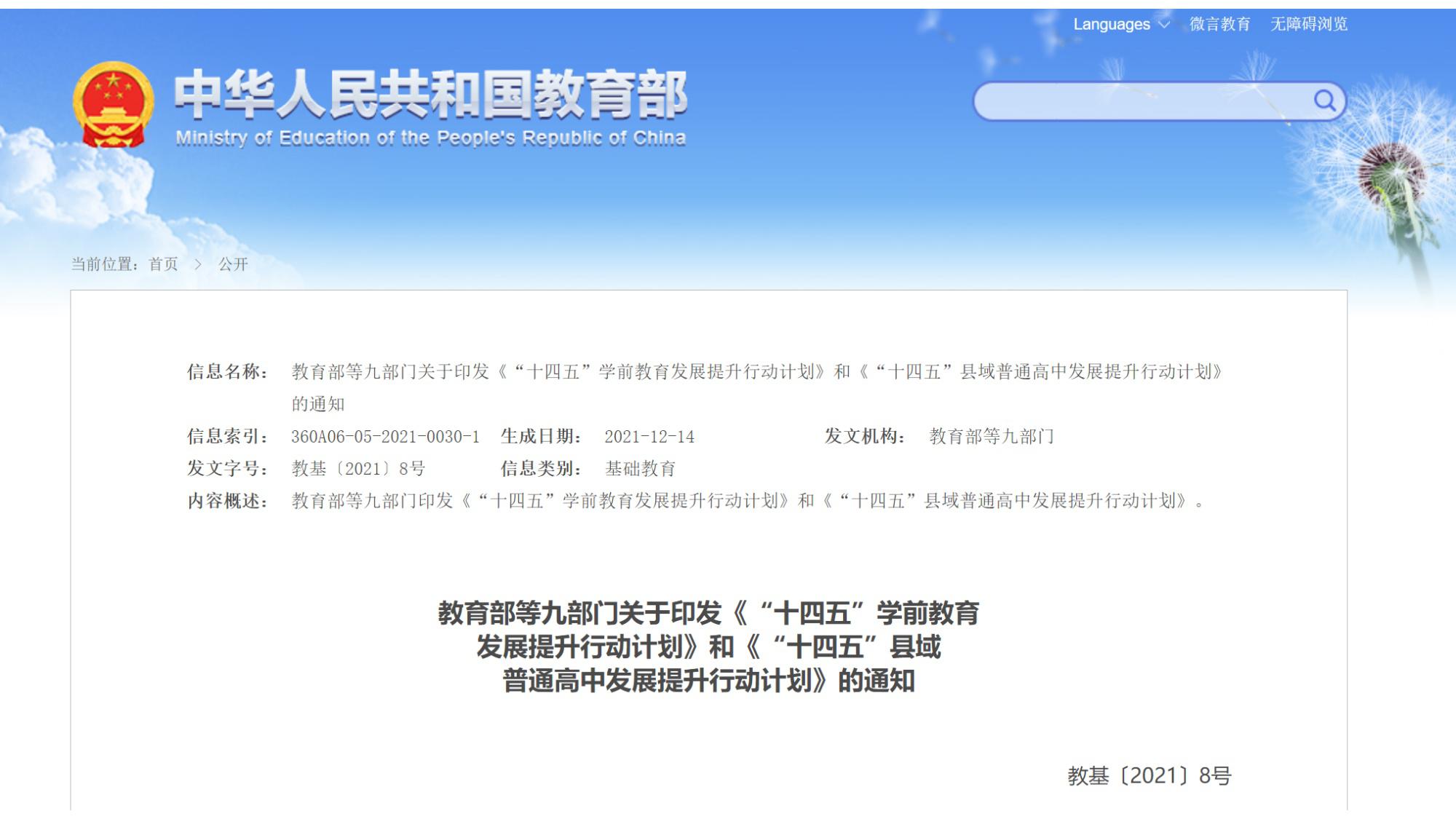 据教育部网站16日消息,为深入贯彻落实党的十九届五中全会“完善普惠性学前教育保障机制”“建设高质量教育体系”的部署要求,积极服务国家人口发展战略,进一步推进学前教育普及普惠安全优质发展,教育部等九部门日前印发《“十四五”学前教育发展提升行动计划》(以下简称《计划》)。