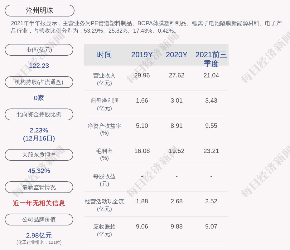 2021年半年报显示,沧州明珠的主营业务为PE管道塑料制品、BOPA薄膜塑料制品、锂离子电池隔膜新能源材料、电子产品行业,占营收比例分别为:53.29%、25.82%、17.43%、0.42%。