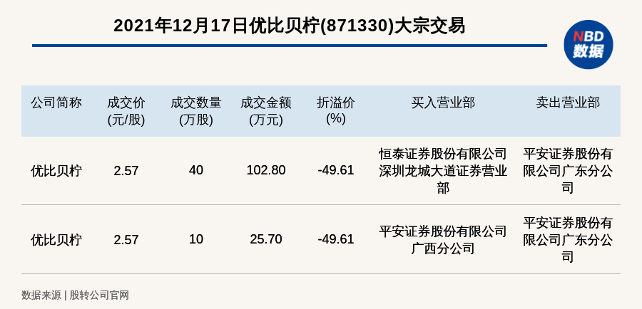 每经讯,2021年12月17日,新三板创新层公司优比贝柠(871330)发生2笔大宗交易,总成交金额为128.50万元,成交金额最高的一笔成交价2.57元/股,成交数量40万股,成交金额102.80万元,折价49.61%。买入营业部是恒泰证券股份有限公司深圳龙城大道证券营业部,卖出营业部是平安证券股份有限公司广东分公司。