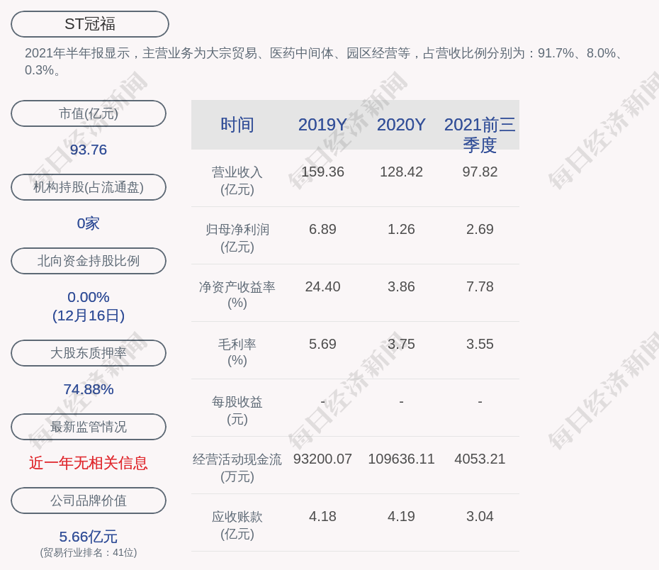 2021年半年报显示,ST冠福的主营业务为大宗贸易、医药中间体、园区经营等,占营收比例分别为:91.7%、8.0%、0.3%。