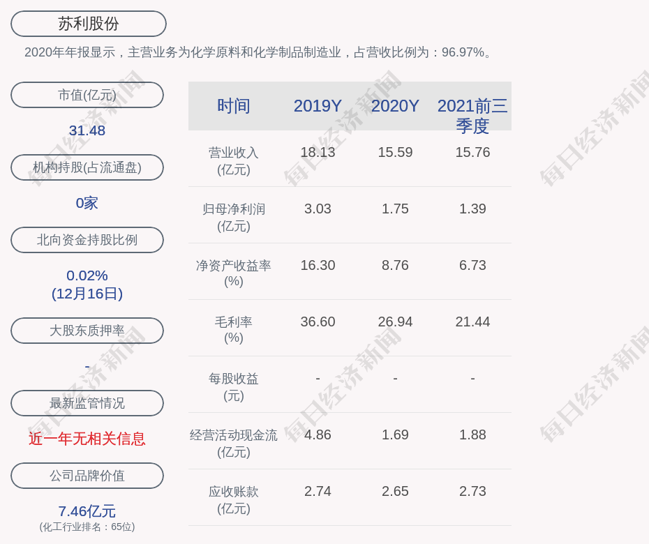 2020年年报显示,苏利股份的主营业务为化学原料和化学制品制造业,占营收比例为:96.97%。
