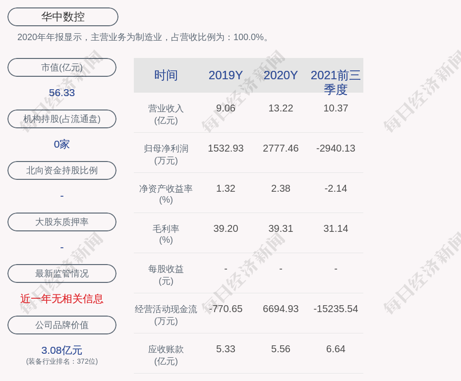 2020年年报显示,华中数控的主营业务为制造业,占营收比例为:100.0%。