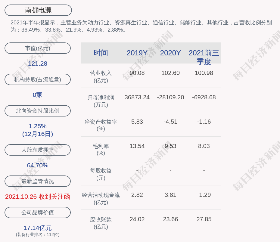 2021年半年报显示,南都电源的主营业务为动力行业、资源再生行业、通信行业、储能行业、其他行业,占营收比例分别为:36.49%、33.8%、21.9%、4.93%、2.88%。