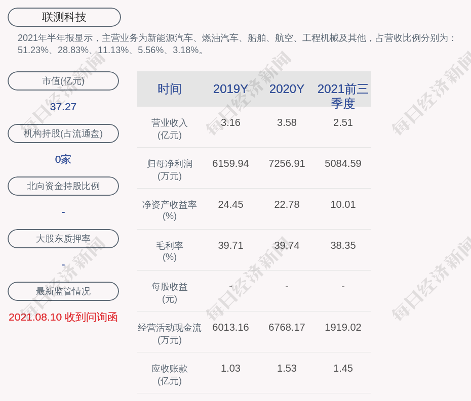 2021年半年报显示,联测科技的主营业务为新能源汽车、燃油汽车、船舶、航空、工程机械及其他,占营收比例分别为:51.23%、28.83%、11.13%、5.56%、3.18%。