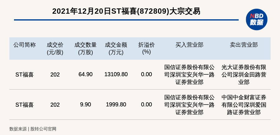 每经讯,2021年12月20日,新三板基础层公司ST福喜(872809)发生2笔大宗交易,总成交金额为15109.60万元,成交金额最高的一笔成交价202元/股,成交数量64.90万股,成交金额13109.80万元,为平价交易。买入营业部是国信证券股份有限公司深圳宝安兴华一路证券营业部,卖出营业部是光大证券股份有限公司深圳金田路营业部。