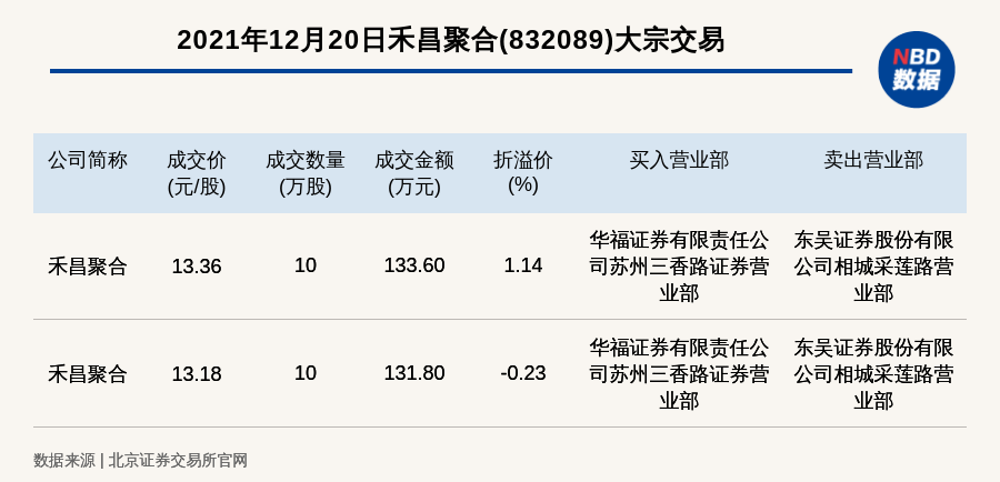每经讯,2021年12月20日,北交所上市公司禾昌聚合(832089)发生2笔大宗交易,溢价率最高的一笔成交价13.36元/股,成交数量10万股,成交金额133.60万元,溢价1.14%。买入营业部是华福证券有限责任公司苏州三香路证券营业部,卖出营业部是东吴证券股份有限公司相城采莲路营业部。