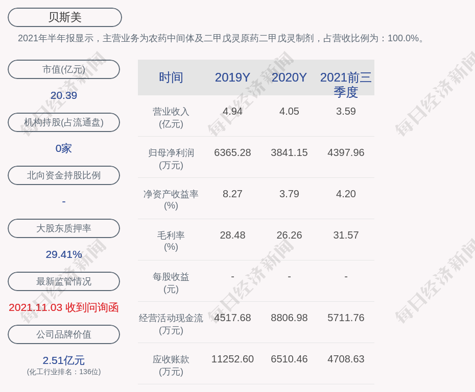 2021年半年报显示,贝斯美的主营业务为农药中间体及二甲戊灵原药二甲戊灵制剂,占营收比例为:100.0%。