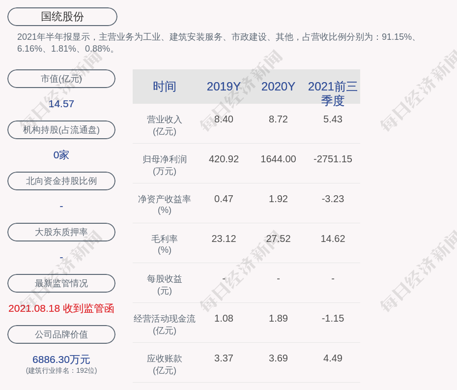 2021年半年报显示,国统股份的主营业务为工业、建筑安装服务、市政建设、其他,占营收比例分别为:91.15%、6.16%、1.81%、0.88%。