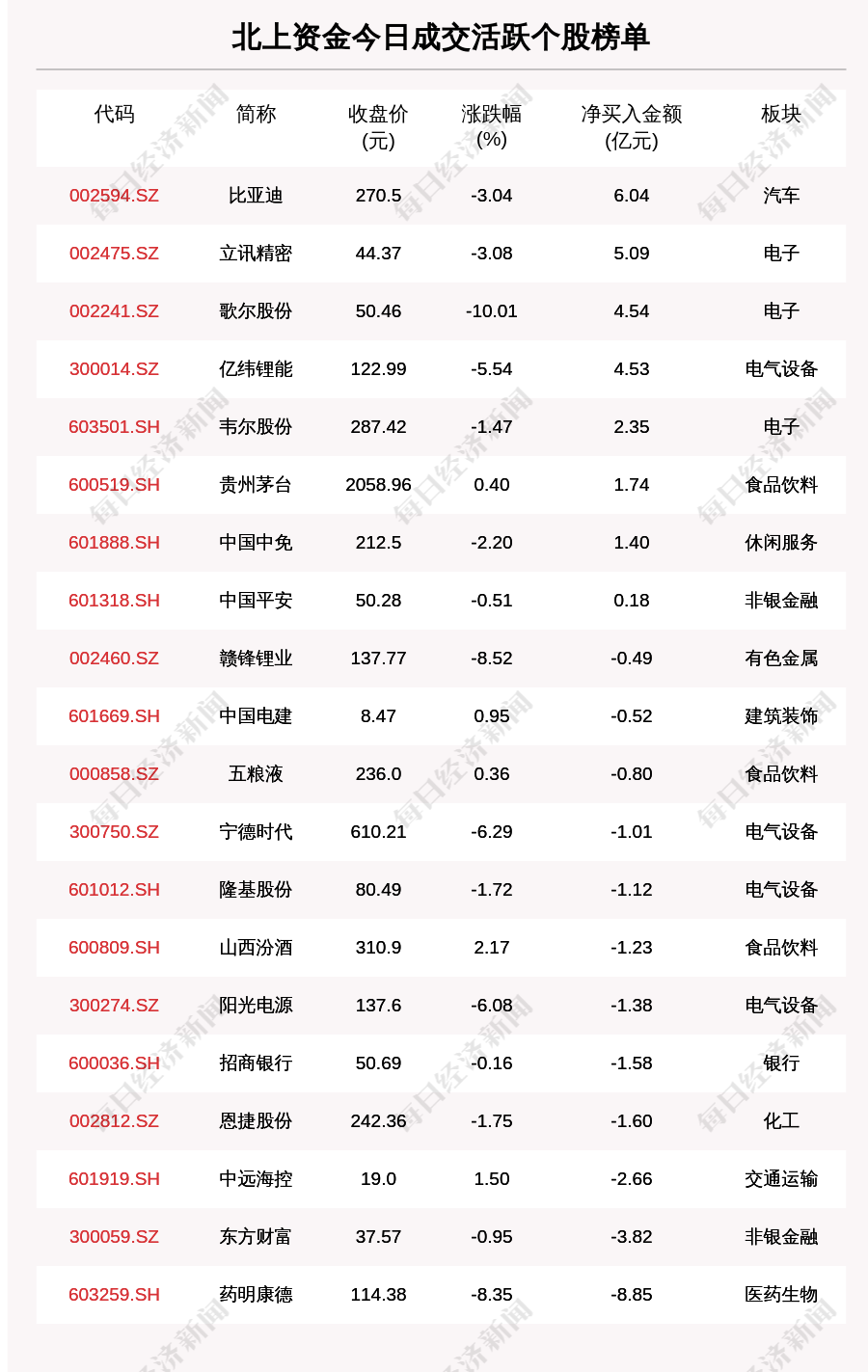 12月20日,北上资金成交活跃个股榜单中,净买入个股共8只,金额最多的是比亚迪(002594.SZ,收盘价:270.5元),净买入6.040亿元;净卖出个股共12只,金额最多的是药明康德(603259.SH,收盘价:114.38元),净卖出8.851亿元。