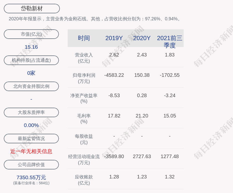 2020年年报显示,岱勒新材的主营业务为金刚石线、其他,占营收比例分别为:97.26%、0.94%。
