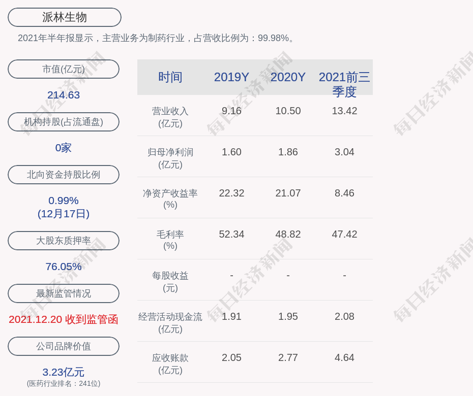 2021年半年报显示,派林生物的主营业务为制药行业,占营收比例为:99.98%。