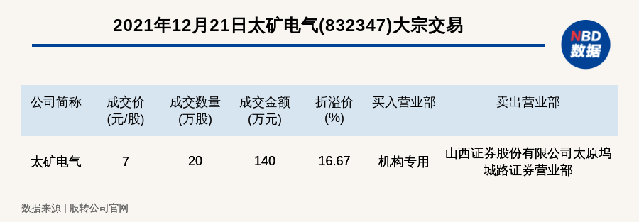 每经讯,2021年12月21日,新三板创新层公司太矿电气(832347)发生一笔大宗交易,成交价7元/股,成交数量20万股,成交金额140万元,溢价16.67%。买入营业部是机构专用,卖出营业部是山西证券股份有限公司太原坞城路证券营业部。