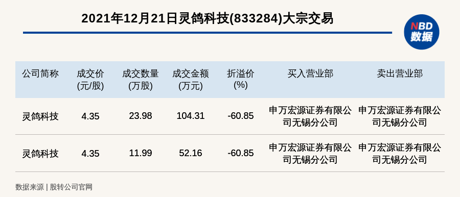 每经讯,2021年12月21日,新三板创新层公司灵鸽科技(833284)发生2笔大宗交易,总成交金额为156.47万元,其中一笔成交价4.35元/股,成交数量11.99万股,成交金额52.16万元,折价60.85%。买入营业部是申万宏源证券有限公司无锡分公司,卖出营业部是申万宏源证券有限公司无锡分公司。