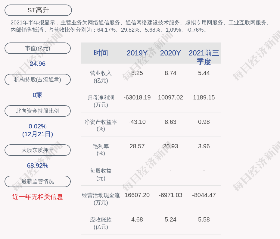 2021年半年报显示,ST高升的主营业务为网络通信服务、通信网络建设技术服务、虚拟专用网服务、工业互联网服务、内部销售抵消,占营收比例分别为:64.17%、29.82%、5.68%、1.09%、-0.76%。