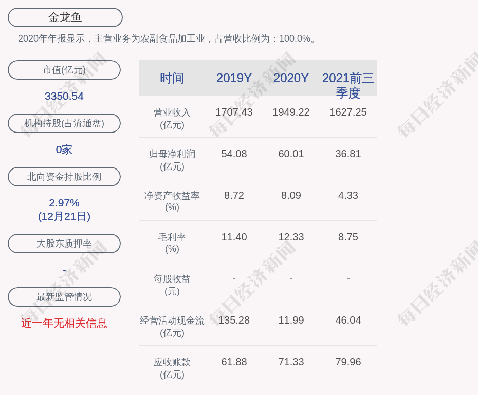 2020年年报显示,金龙鱼的主营业务为农副食品加工业,占营收比例为:100.0%。