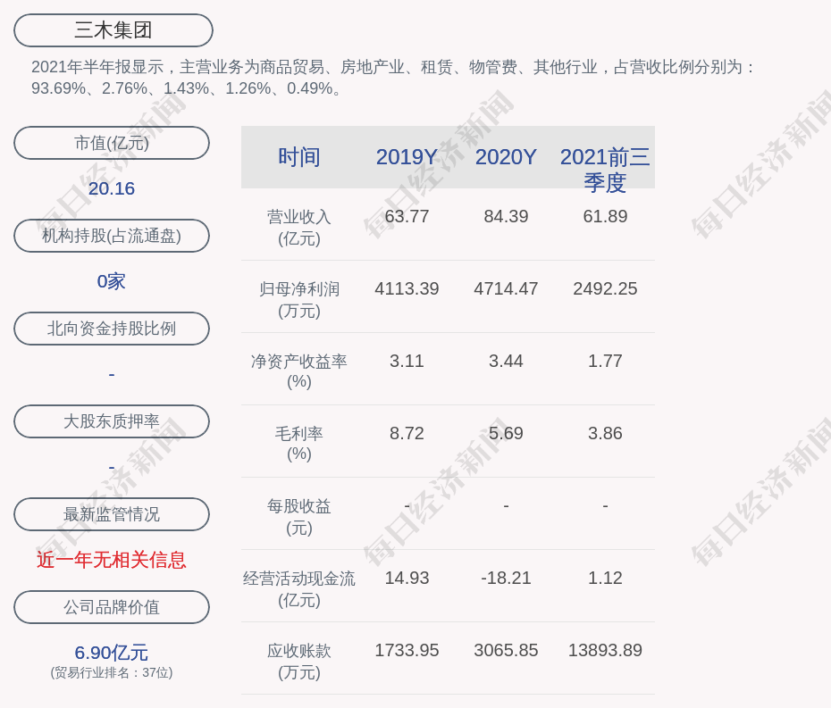 2021年半年报显示,三木集团的主营业务为商品贸易、房地产业、租赁、物管费、其他行业,占营收比例分别为:93.69%、2.76%、1.43%、1.26%、0.49%。