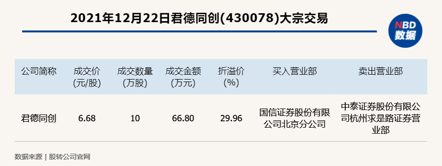 每经讯,2021年12月22日,新三板基础层公司君德同创(430078)发生一笔大宗交易,成交价6.68元/股,成交数量10万股,成交金额66.80万元,溢价29.96%。买入营业部是国信证券股份有限公司北京分公司,卖出营业部是中泰证券股份有限公司杭州求是路证券营业部。