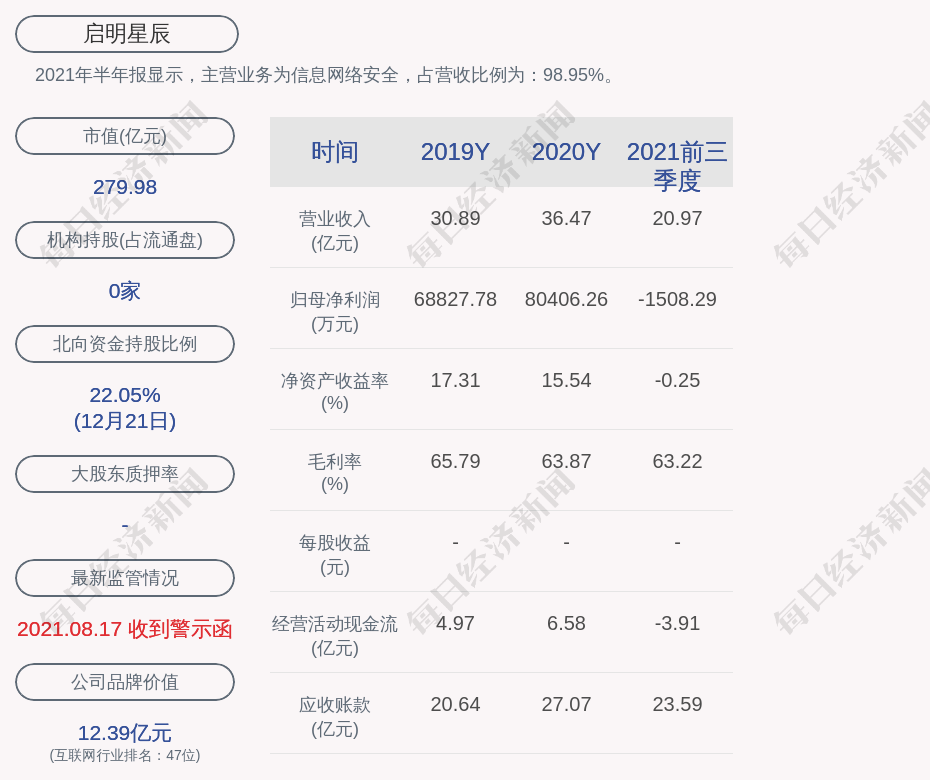 2021年半年报显示,启明星辰的主营业务为信息网络安全,占营收比例为:98.95%。