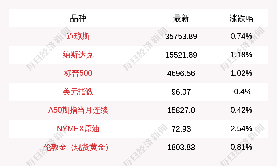每经AI快讯:北京时间12月23日05:00,道琼斯收盘上涨261.19点,涨幅为0.74%,报35753.89点;纳斯达克收盘上涨180.8点,涨幅为1.18%,报15521.89点;标普500收盘上涨47.33点,涨幅为1.02%,报4696.56点;富时中国A50指数期货上涨66.0点,涨幅为0.42%,报15827.0点;NYMEX原油收盘上涨1.81点,涨幅为2.54%,报72.93点;美元指数收盘下跌0.39点,跌幅为0.4%,报96.07点;伦敦金(现货黄金)收盘上涨14.56点,涨幅为0.81%,报1803.83点。