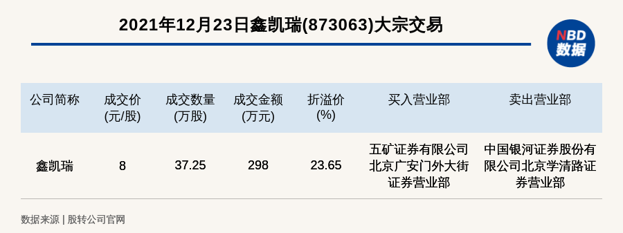 每经讯,2021年12月23日,新三板创新层公司鑫凯瑞(873063)发生一笔大宗交易,成交价8元/股,成交数量37.25万股,成交金额298万元,溢价23.65%。买入营业部是五矿证券有限公司北京广安门外大街证券营业部,卖出营业部是中国银河证券股份有限公司北京学清路证券营业部。