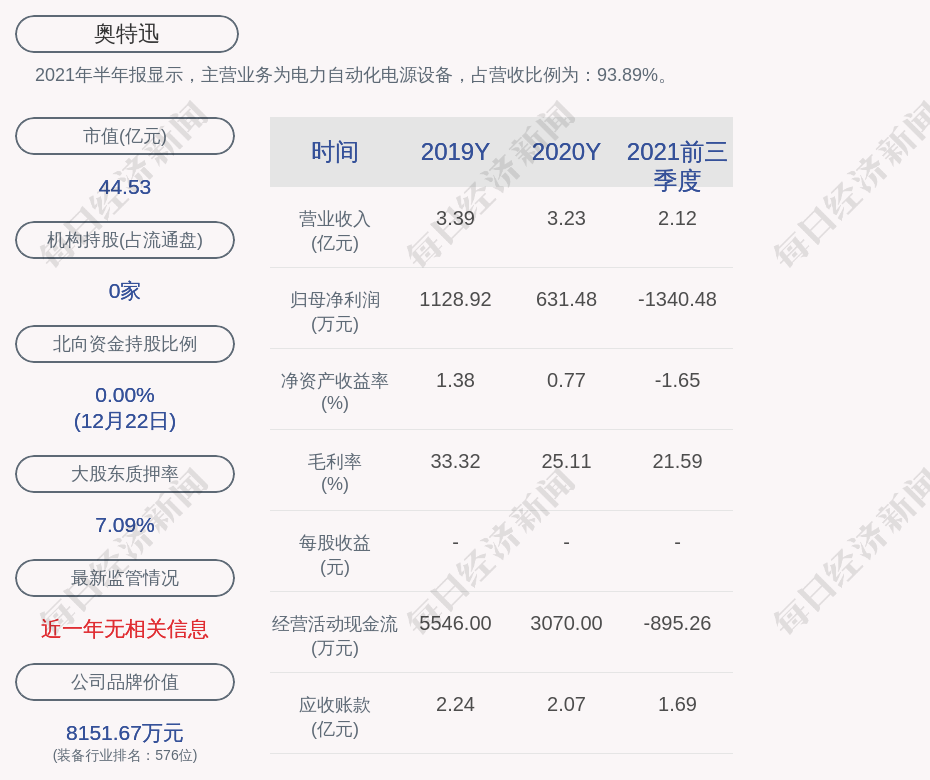 2021年半年报显示,奥特迅的主营业务为电力自动化电源设备,占营收比例为:93.89%。